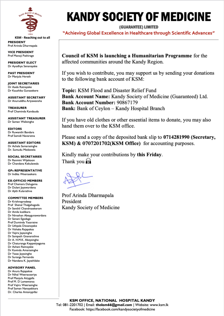 Ava Charity has found a local partner in Hashini’s cousin, Professor Dr. Arinda Dharmapala. He has mobilised the Kandy Society of Medicine to take donations and provide relief in the area in around Kandy, which is one of the hardest hit areas due to the mountainous landscape. We have so far donated LKR 100 000 to this cause, with a pledge to donate more as required.